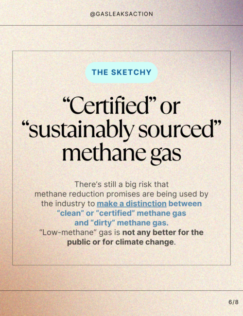 There’s still a big risk that methane reduction promises are being used by the industry to make a distinction between “clean” or “certified” or “differentiated” methane gas and “dirty” methane gas. The science is clear: all methane gas is a planet-warming fossil fuel just like coal and oil, and it all has to go if we’re serious about avoiding climate disaster. Efforts to paint gas as “clean” is the next chapter in the industry’s decades-long campaign to mislead the public about the harms of their product.